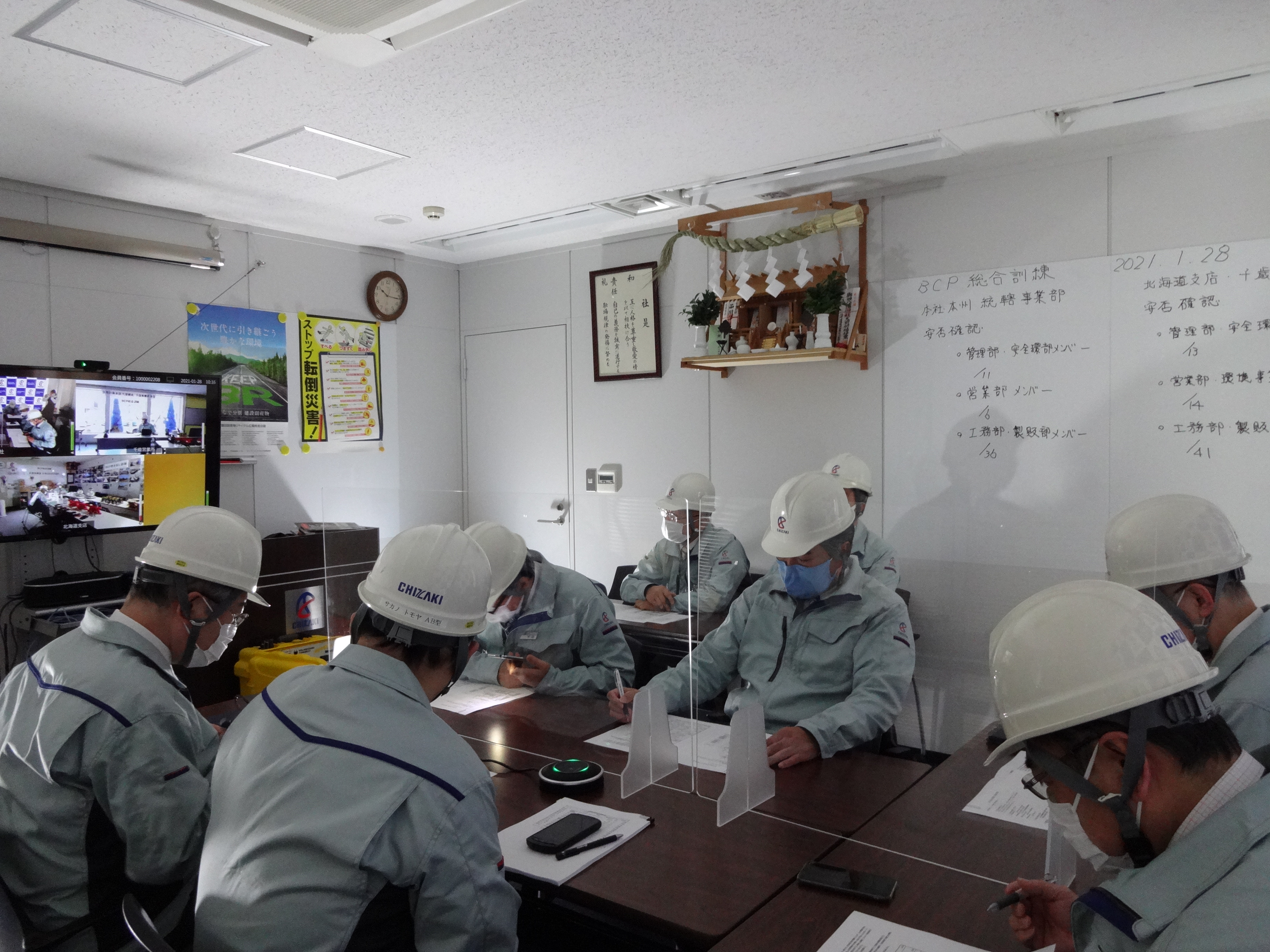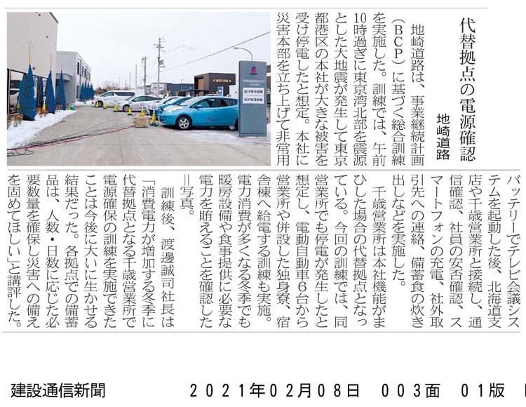 弊社では1月28日、事業継続計画(BCP)に基づく総合訓練を実施しました。午前10時過ぎに東京湾北部を震源とした大地震が発生し本社が大きな被害を受け停電したと想定、本社に災害対策本部を立ち上げ、非常用バッテリーでTV会議システムを起動し北海道支店、千歳営業所の各拠点との通信確認、安否確認、スマートフォンの充電、社外取引先への連絡、備蓄食の炊き出し訓練を行いました。本社機能がまひした場合の代替拠点としている千歳営業所でも、停電したとの想定で、電源供給が可能な乗用車6台からの給電訓練を行いました。