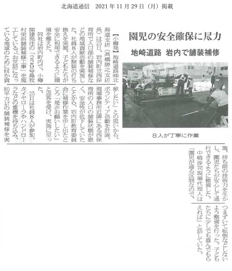 弊社北海道支店では11月25日に、地域貢献活動として北海道岩内町立西保育所において舗装整備を行いました。