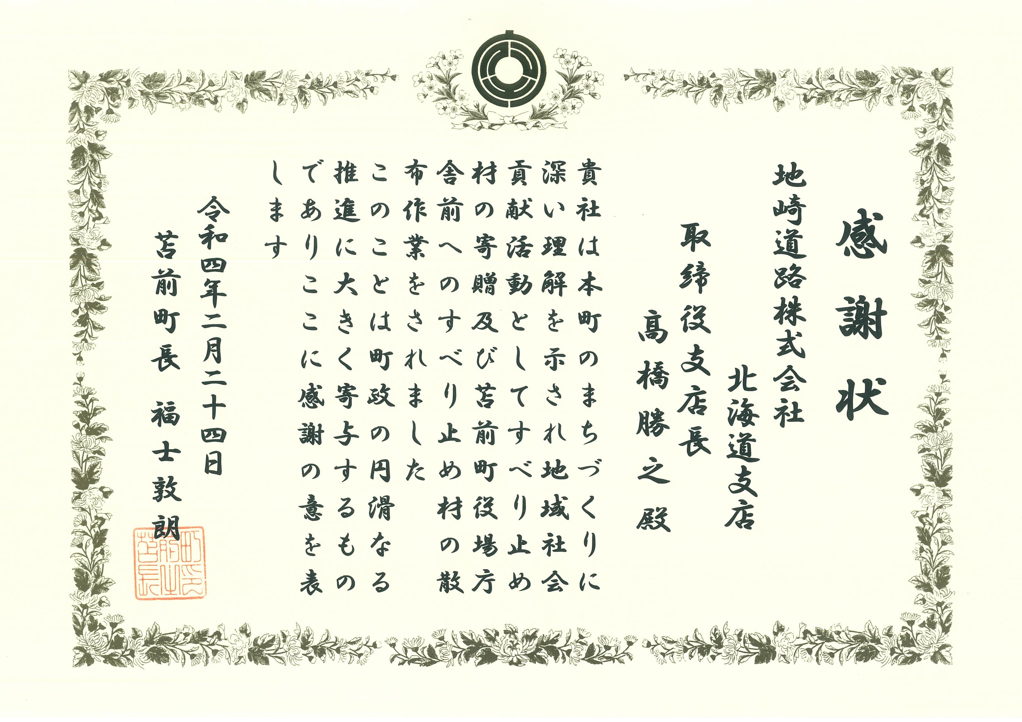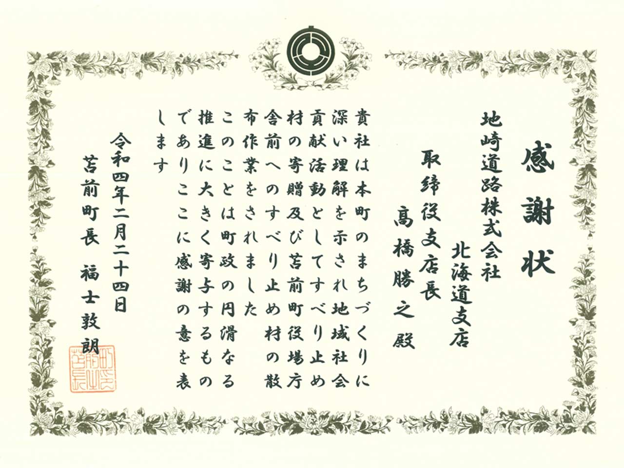 また役場庁舎玄関前の凍結路面にも散布作業を行い、2月24日福士苫前町長より感謝状をいただきました。
