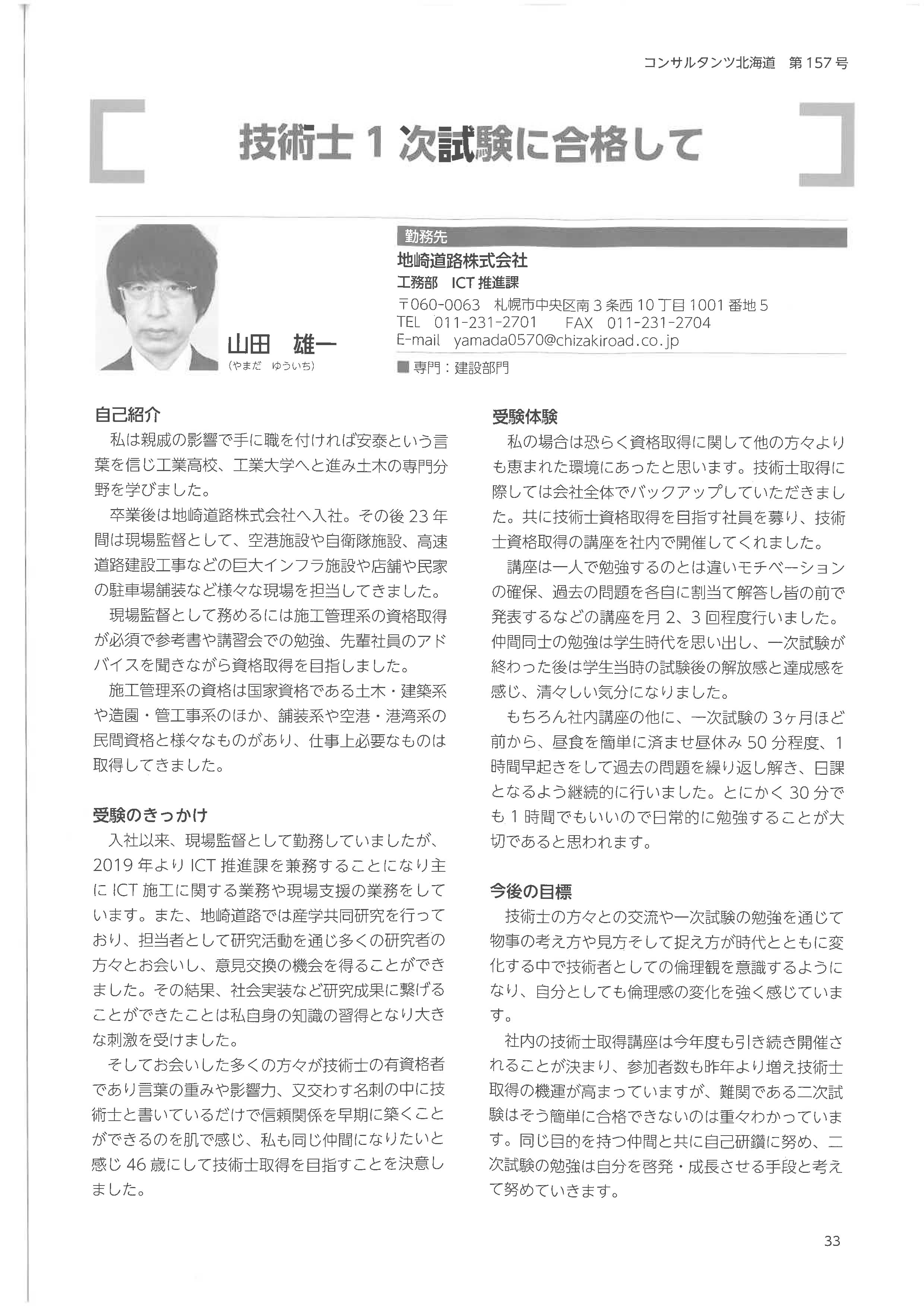 当社社員の山田雄一(工務部ICT推進課)が技術士1次試験に合格し、(公社)日本技術士会北海道支部会誌「コンサルタンツ北海道」第157号に、手記「技術士1次試験に合格して」が掲載されました。