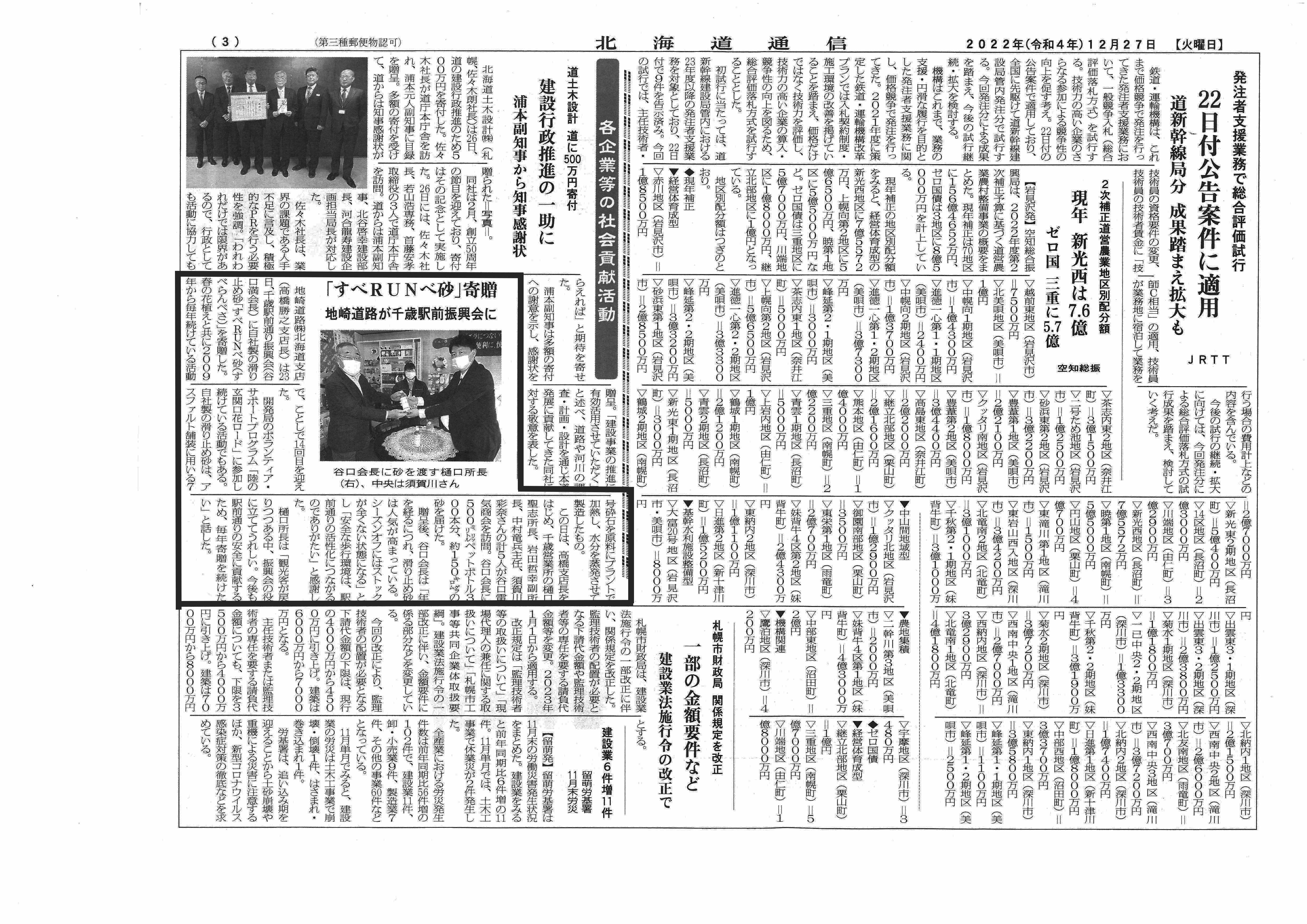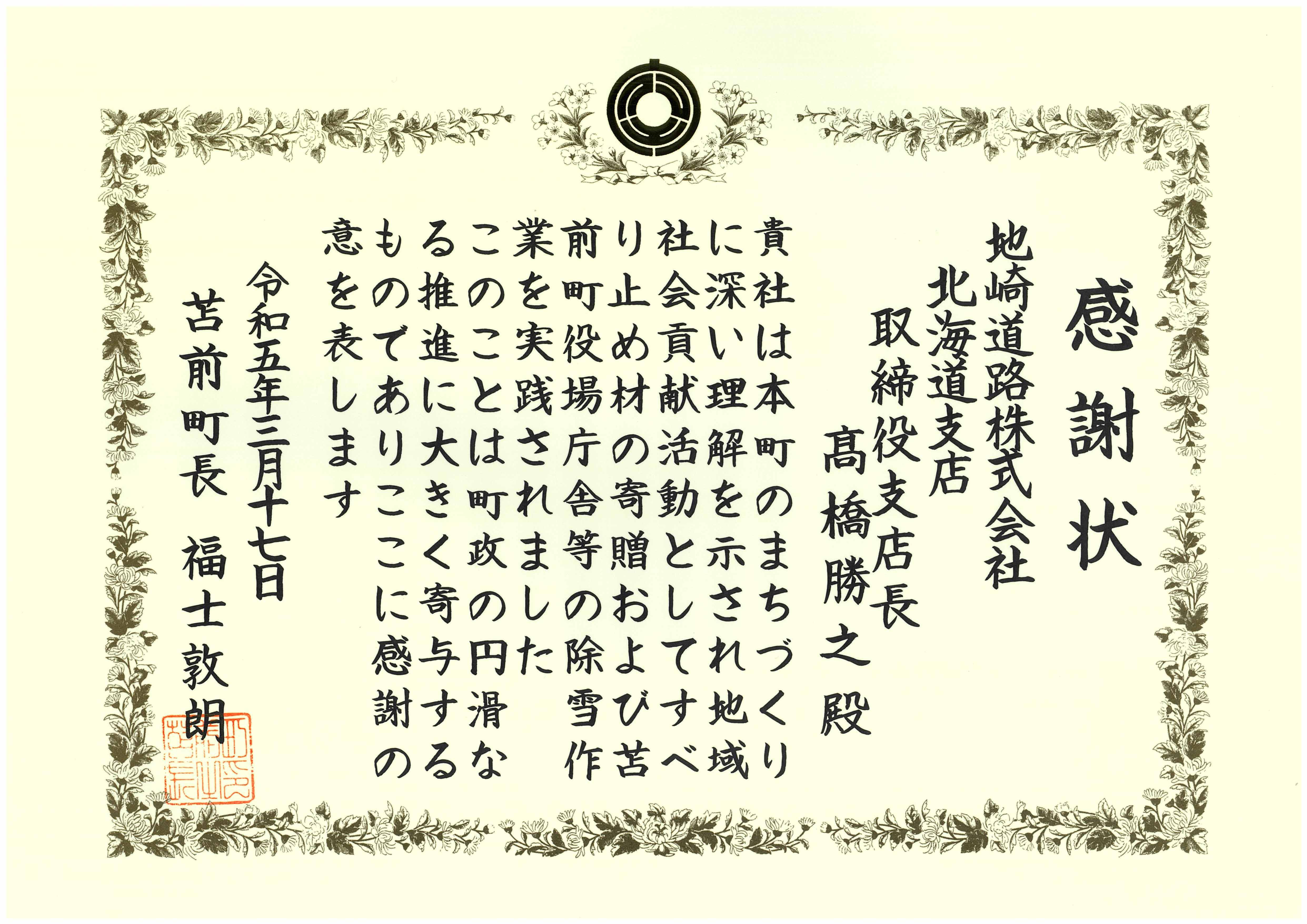 当社北海道支店では、2023年2月8日に昨年度に引き続き北海道苫前町に自社製滑り止め材「すべRUNベ砂(すべらんべさ)」を寄贈し、併せて苫前町役場庁舎等の除雪作業を行い、3月17日に福士町長から町政の円滑な推進に大きく寄与するとして感謝状をいただきました。今後とも当社は地域貢献活動に積極的に取り組んでまいります。